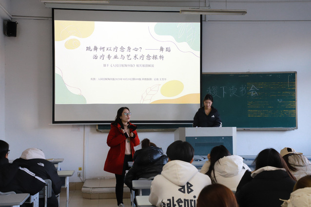 本次读书会聚焦“舞蹈疗愈”核心议题,23级张晓雨、25级吕钰颖、滕嘉悦、蒋晨曦、孙艺芯同学分别做了主题分享,深度研读了《舞动疗愈在大学生心理健康教育中的应用》《身体·文化·疗愈:舞蹈治疗的中国路径》等多篇前沿文献,从学术视角剖析舞蹈疗愈在心理健康教育、跨文化实践中的应用与发展,探讨国内外艺术疗愈的研究热点与动态,解答“跳舞何以疗愈身心”的核心问题。这些兼具理论深度与实践价值的文献,为同学们打开了舞蹈疗愈领域的全新视野。