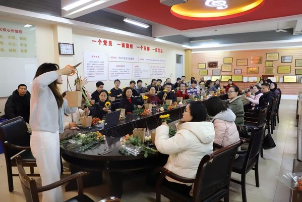 活动现场花香四溢、暖意融融。学院精心准备了各式各样的花材与花艺工具,并特邀专业花艺师现场指点。花艺师悉心指导,助力老师们完善插花造型,大家其乐融融,欢聚一堂。