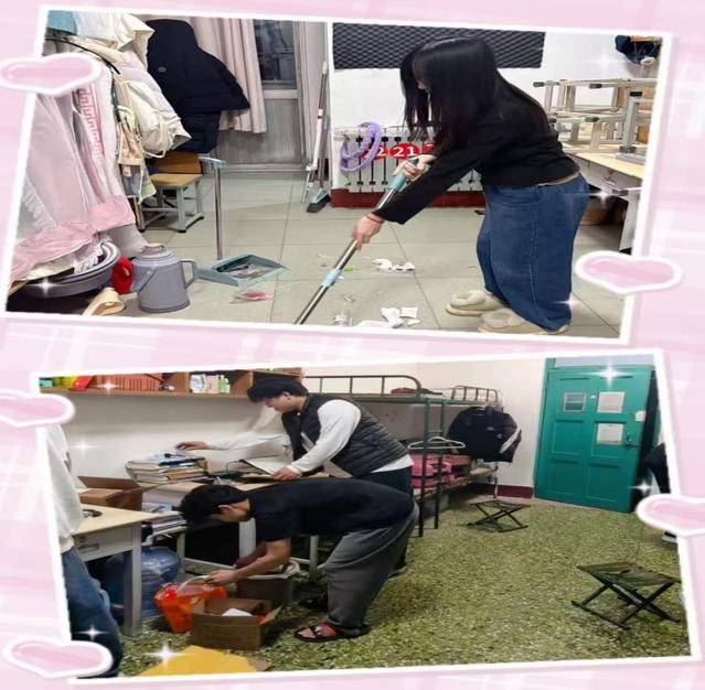 在班委们的精准指正与全体同学的积极响应下,各宿舍迅速投入整改行动。同学们分工协作、各司其职:有的弯腰清扫地面,不放过任何一处污渍;有的整理床铺衣物,将衣物叠得方方正正;有的擦拭柜子门窗,让桌面、柜面重现洁净光泽;有的归类摆放物品,让杂乱的空间变得井然有序。大家相互配合、干劲十足,原本存在的卫生问题在齐心协力中逐一解决。