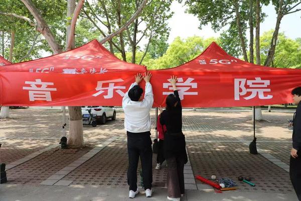 运动会筹备现场,学院师生齐心协力、分工协作、默契配合,大家一同悬挂主题横幅、规整布置看台,红色的“音乐学院”横幅迎风舒展,醒目亮眼,充分展现了音乐学院学子极强的凝聚力、向心力与责任担当。